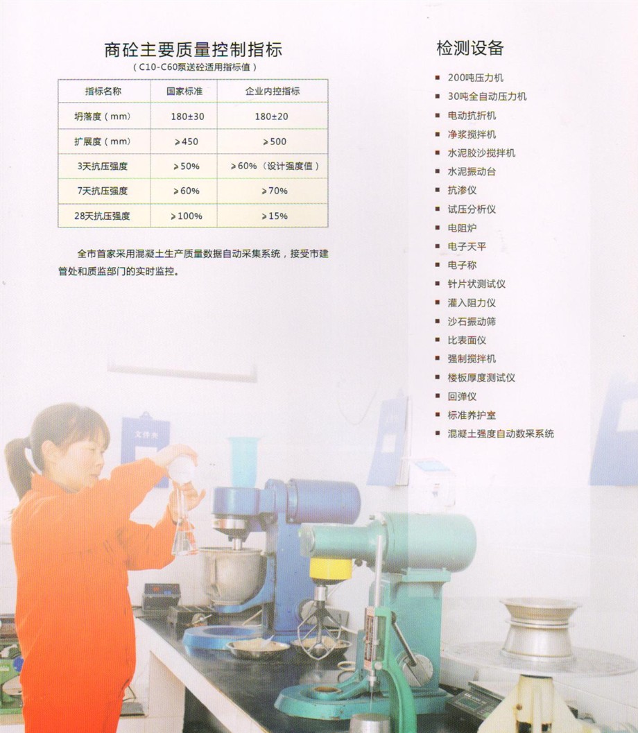 公司設(shè)有先進(jìn)的實(shí)驗(yàn)室,配備全套混凝土及原材料檢測(cè)試驗(yàn)設(shè)備,配有專職的試驗(yàn)、檢驗(yàn)人員,可承擔(dān)混凝土的材料性能試驗(yàn),工藝質(zhì)量控制、產(chǎn)品質(zhì)量檢驗(yàn)等全部試驗(yàn)、檢驗(yàn)項(xiàng)目,為確保混凝土質(zhì)量提供了可靠的保證。